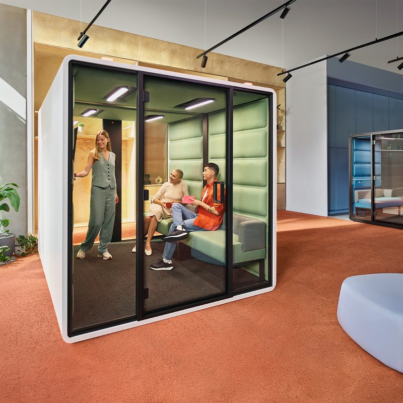 HushFree booths are a great acoustic solution for flexible meeting spaces within office spaces. The hushFree.S pod fits a single person, and the hushFree.M fits smaller groups than the hushFree.L. User control options include ventilation and lighting.